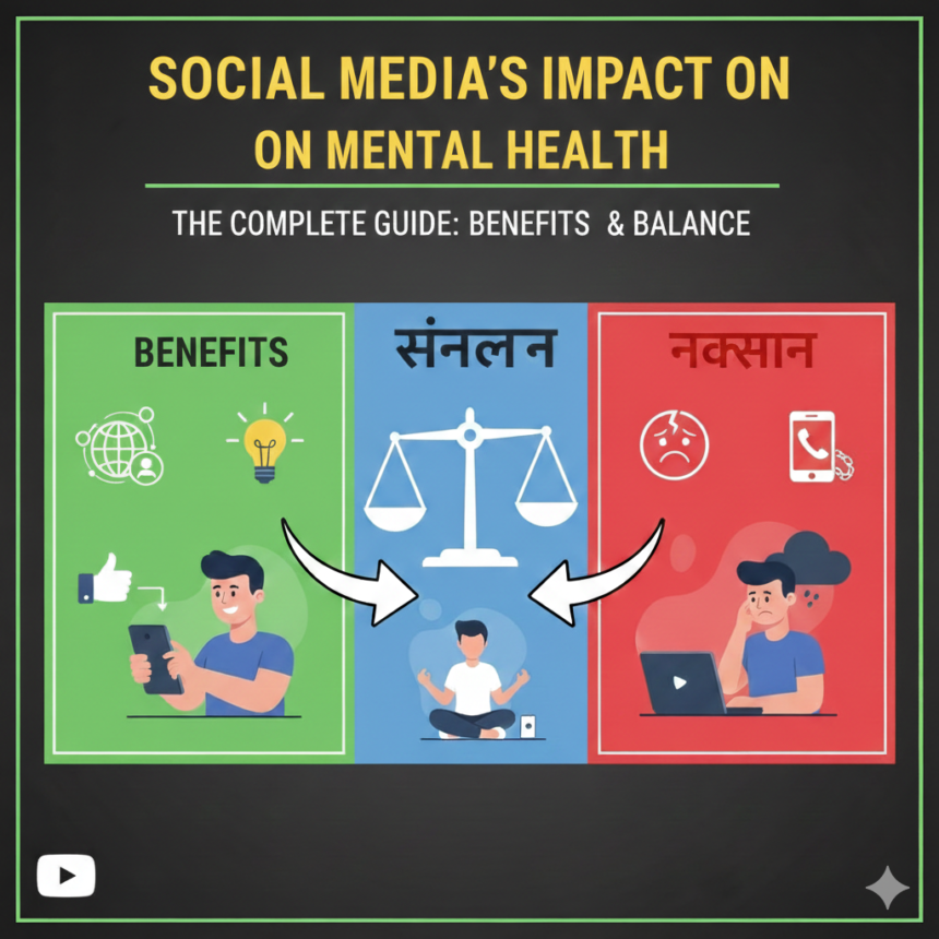 सोशल मीडिया का मानसिक स्वास्थ्य पर प्रभाव दो तरफा है। यह connectivity, awareness और opportunities देता है, लेकिन comparison, addiction और anxiety भी बढ़ा सकता है।